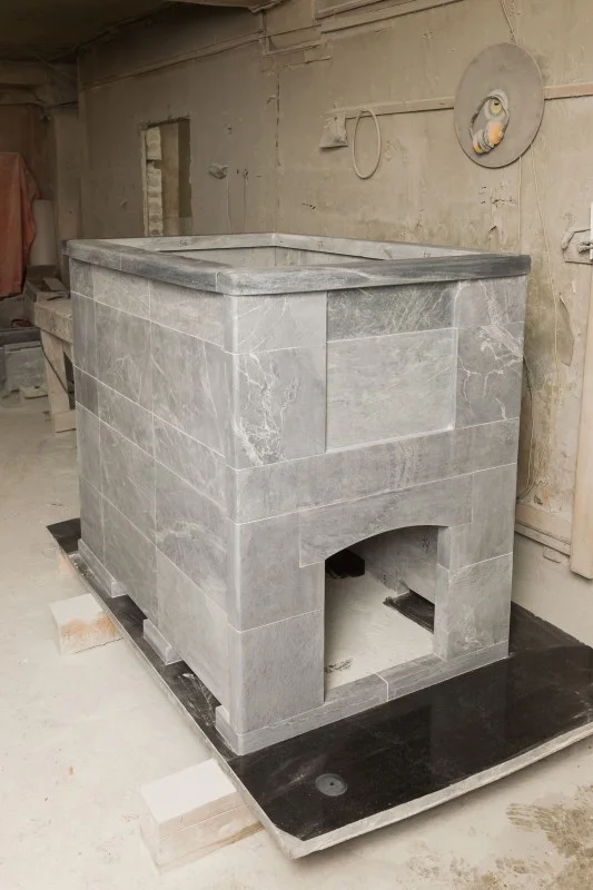 Внешний корпус печи выполняется из шлифованного ТАЛЬКОХЛОРИТА или СЕРПЕНТИНИТА с обработкой антик или полировка.