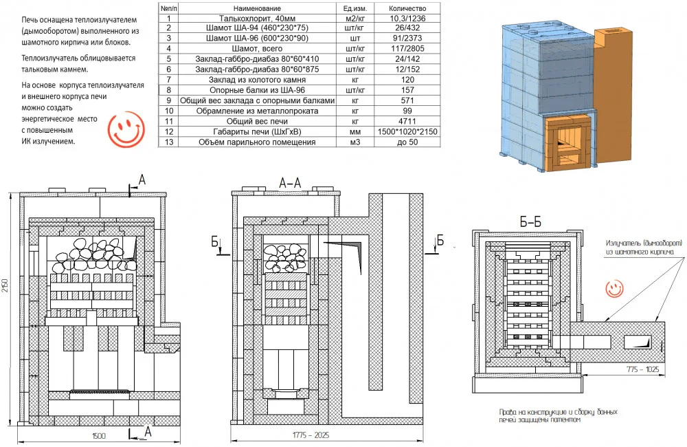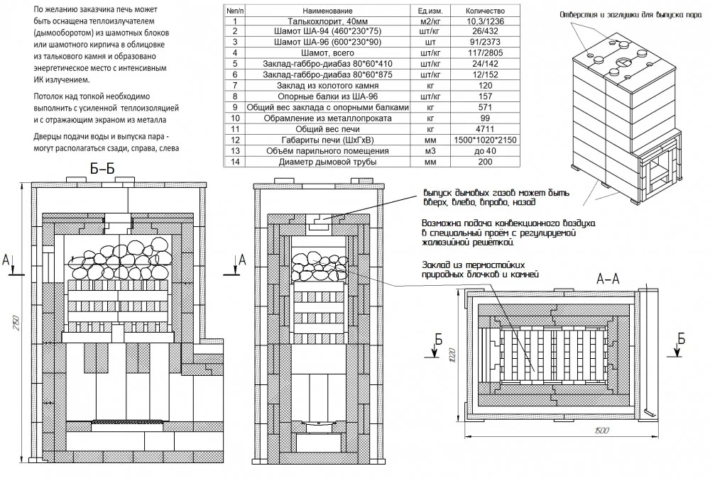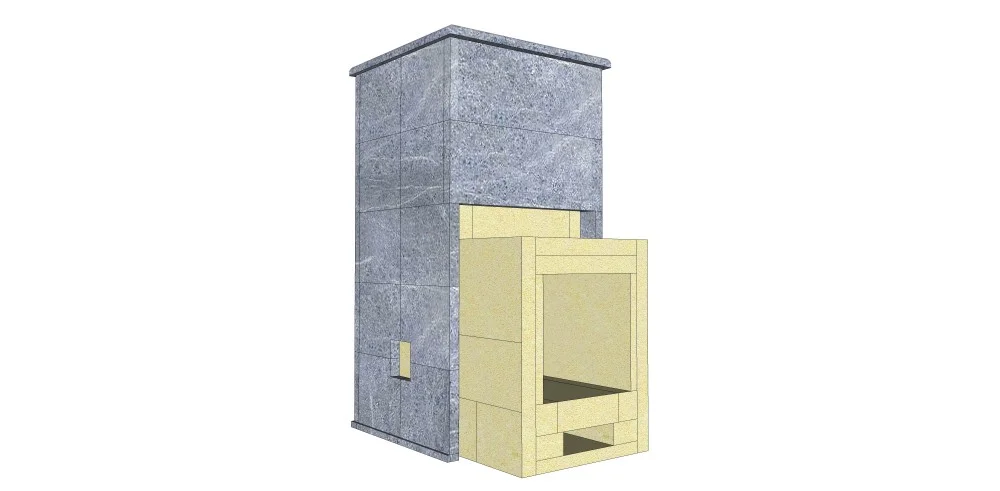 Быстрый разогрев парилки, за счёт конвекционного воздуха, проходящего между шамотной топкой и внешним корпусом из талькового камня. Регулировка подачи конвекционного воздуха между топкой и внешним корпусом Печи при разогреве и парении, что позволяет менять микроклимат в парильном помещении.