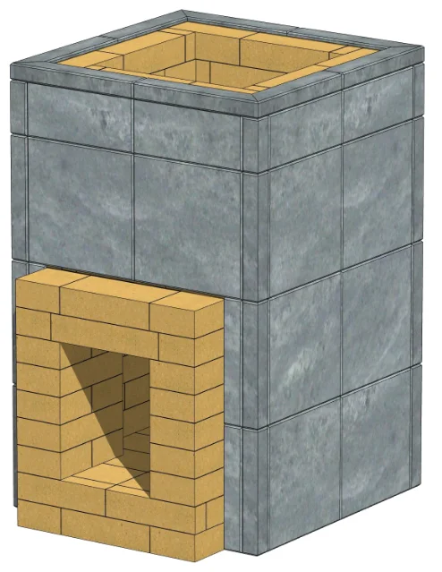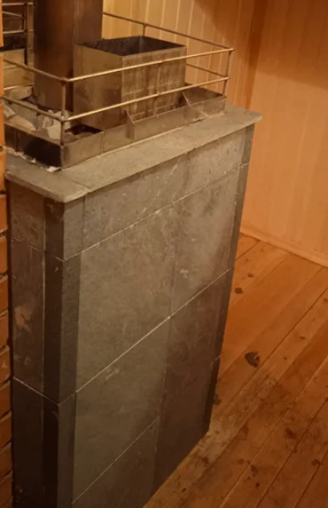 - Расположенная внутри шамотной топки и закрытая с 5 сторон каменка из котловой стали толщиной 6 мм или нержавеющей стали AISI 321 толщиной 3 мм не контактирует с воздухом парильного отделения