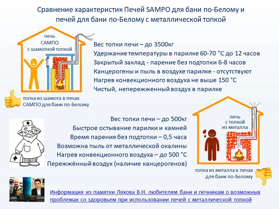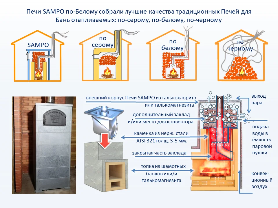 Печи SAMPO для Бани по-Белому имеют ключевые отличия перед печами с металлической топкой для бани по-белому: