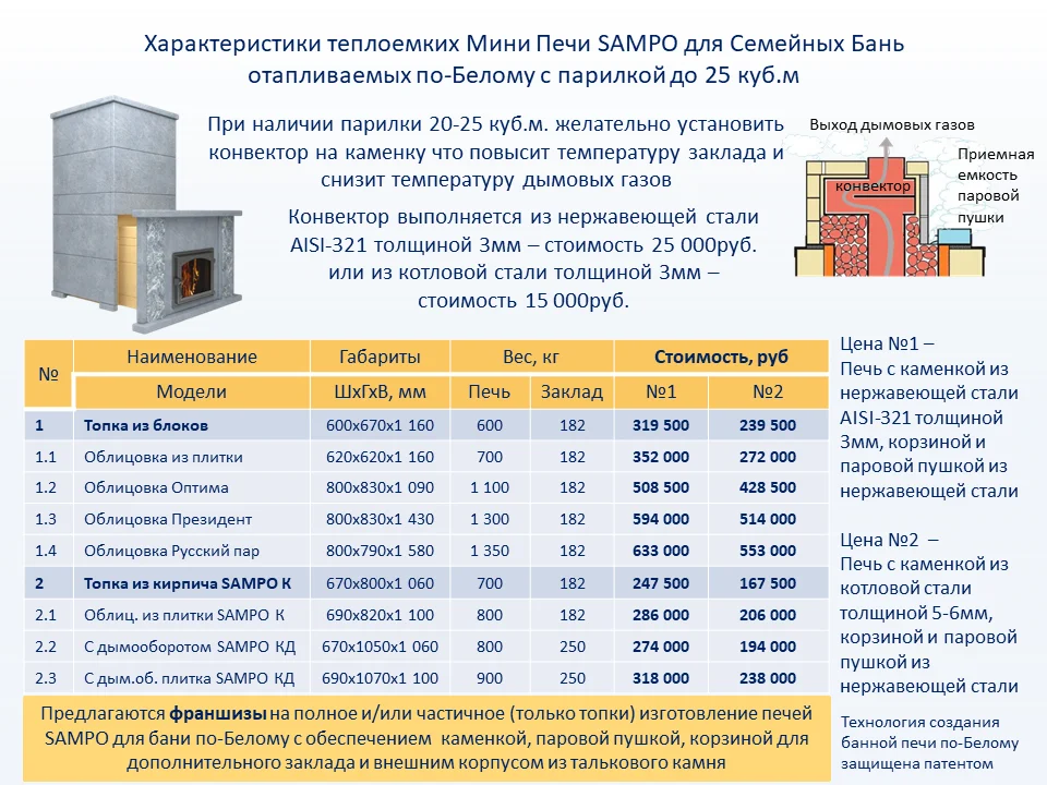 Для максимального объема парилки рекомендуется использовать совместно с печью: теплоизлучатели (дымооборот), конвекторы и заклад из нержавеющих цилиндров в нижней части каменки.