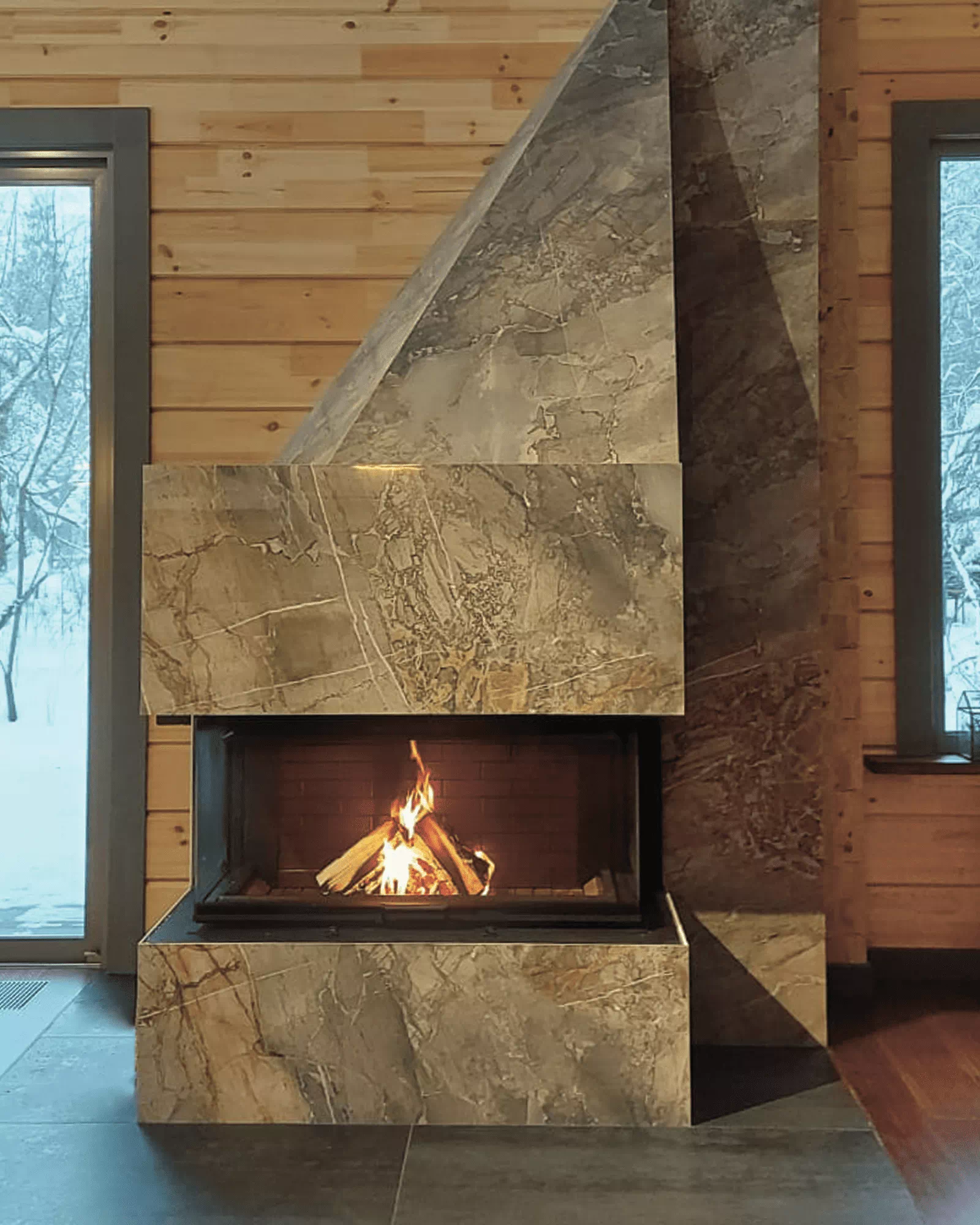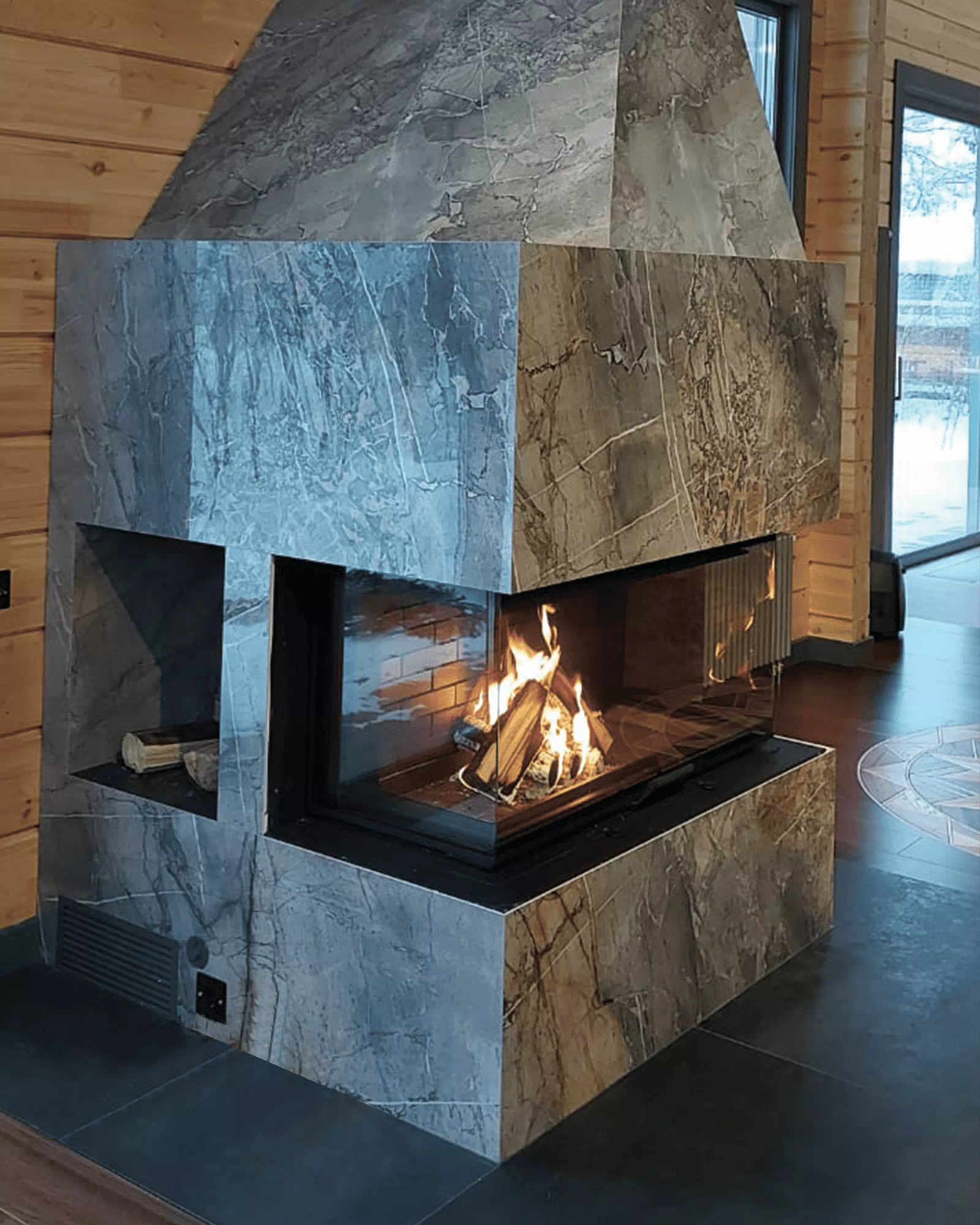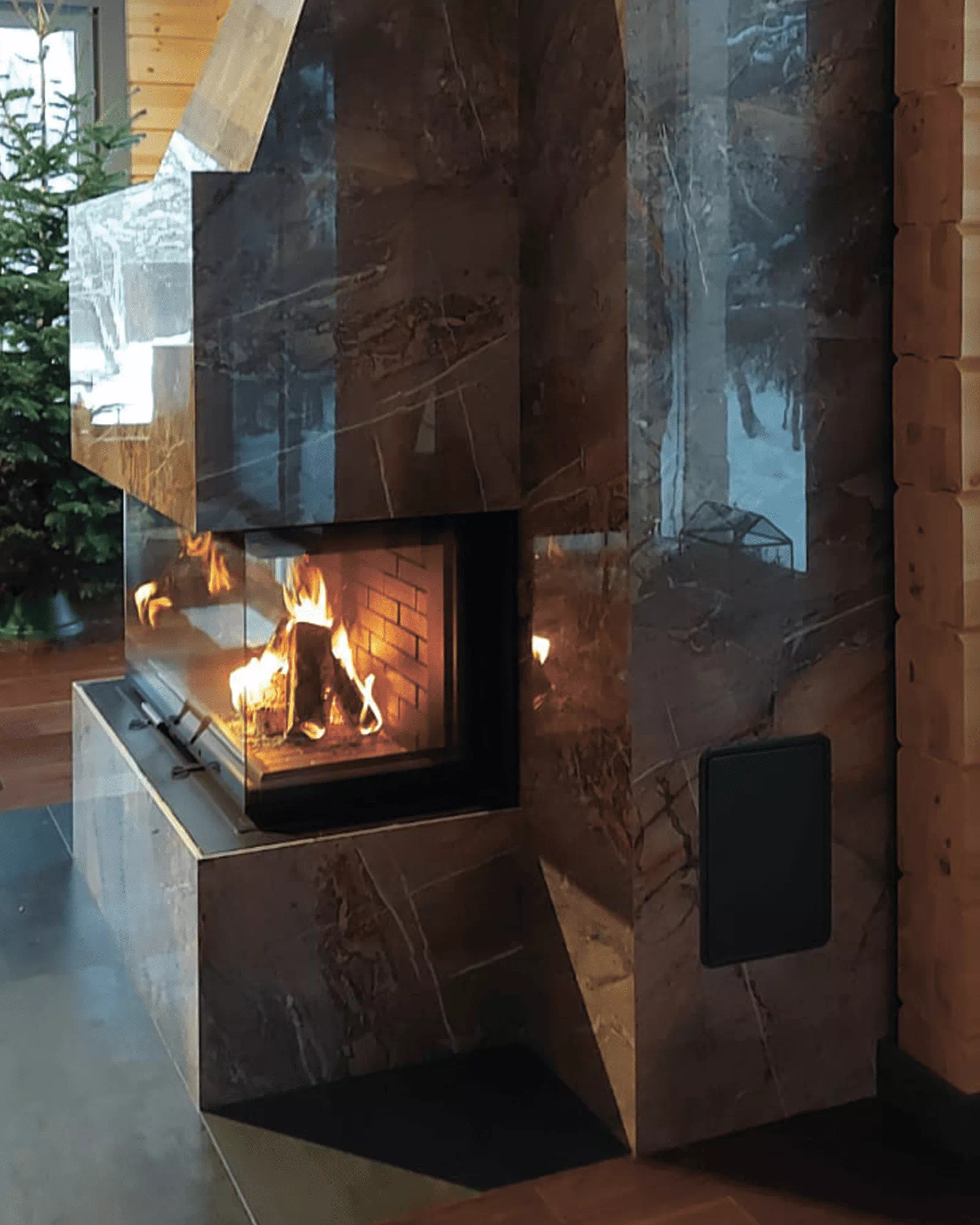 Задняя стенка двойная. Футеровка формирует структуру, несущую на себе всю термическую нагрузку. Бесколосниковая (подовая) конструкция способствует эффективному сгоранию. Шамот, керамические вставки – стенки разогреваются продолжительно, температура повышается дольше, чем с металлическим содержимым. Превосходно для любителей долго пожечь. Панели 3Д – сбалансированный вариант, тепло распределяется равномерно, а внушительная масса поддерживает высокотемпературное горение. Широкие стальные пластины для стиля хай-тек. Вид на огонь