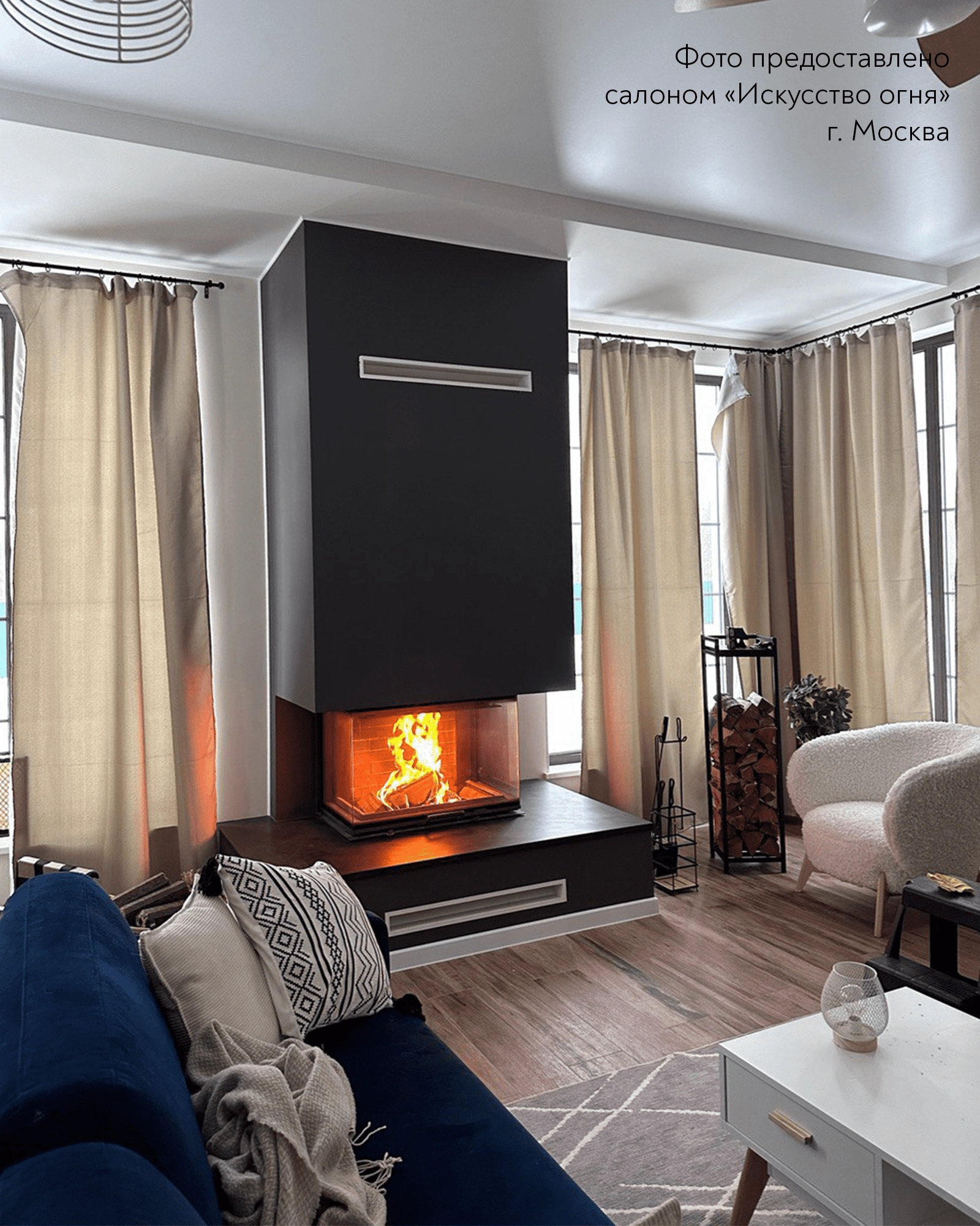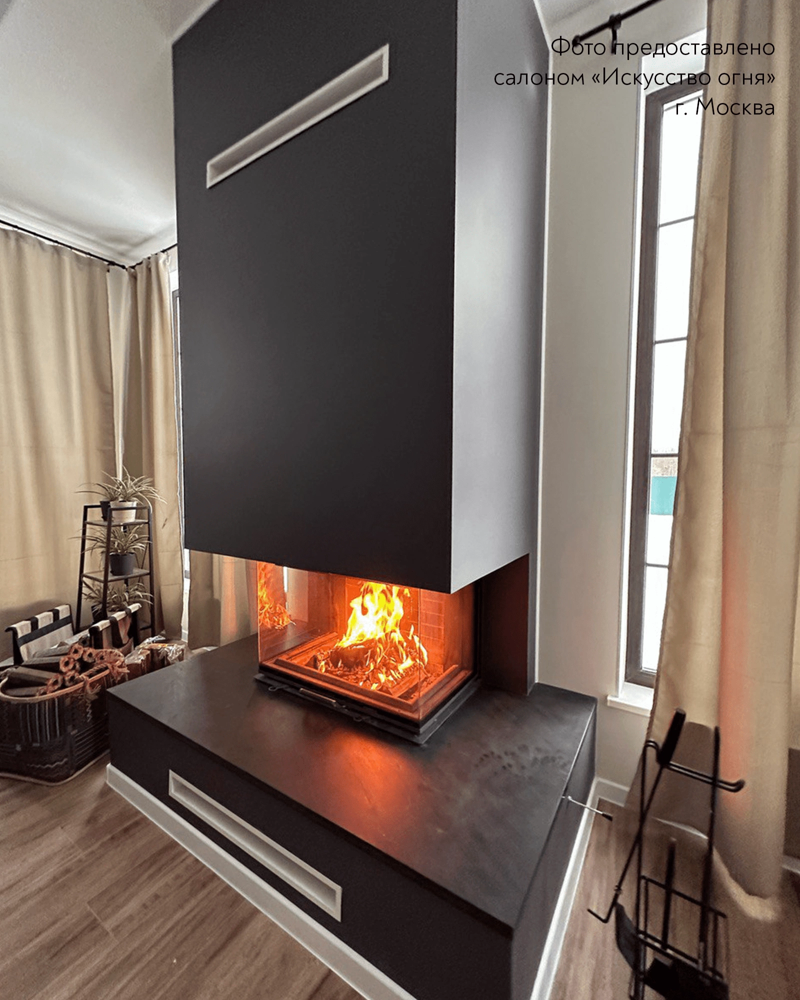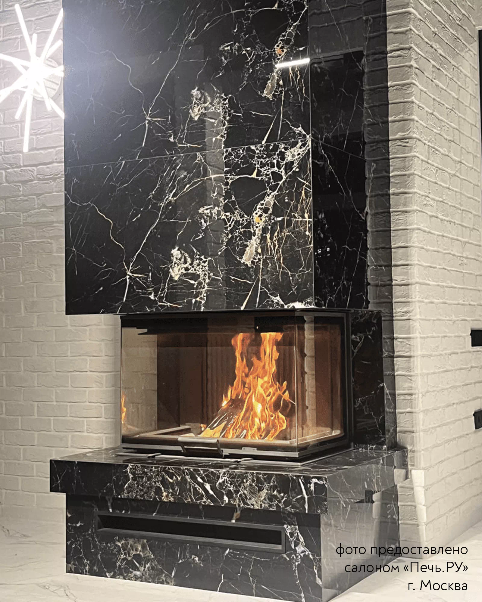 Задняя стенка двойная. Футеровка формирует структуру, несущую на себе всю термическую нагрузку. Бесколосниковая (подовая) конструкция способствует эффективному сгоранию. Шамот, керамические вставки – стенки разогреваются продолжительно, температура повышается дольше, чем с металлическим содержимым. Превосходно для любителей долго пожечь. Панели 3Д – сбалансированный вариант, тепло распределяется равномерно, а внушительная масса поддерживает высокотемпературное горение. Широкие стальные пластины для стиля хай-тек. Вид на огонь