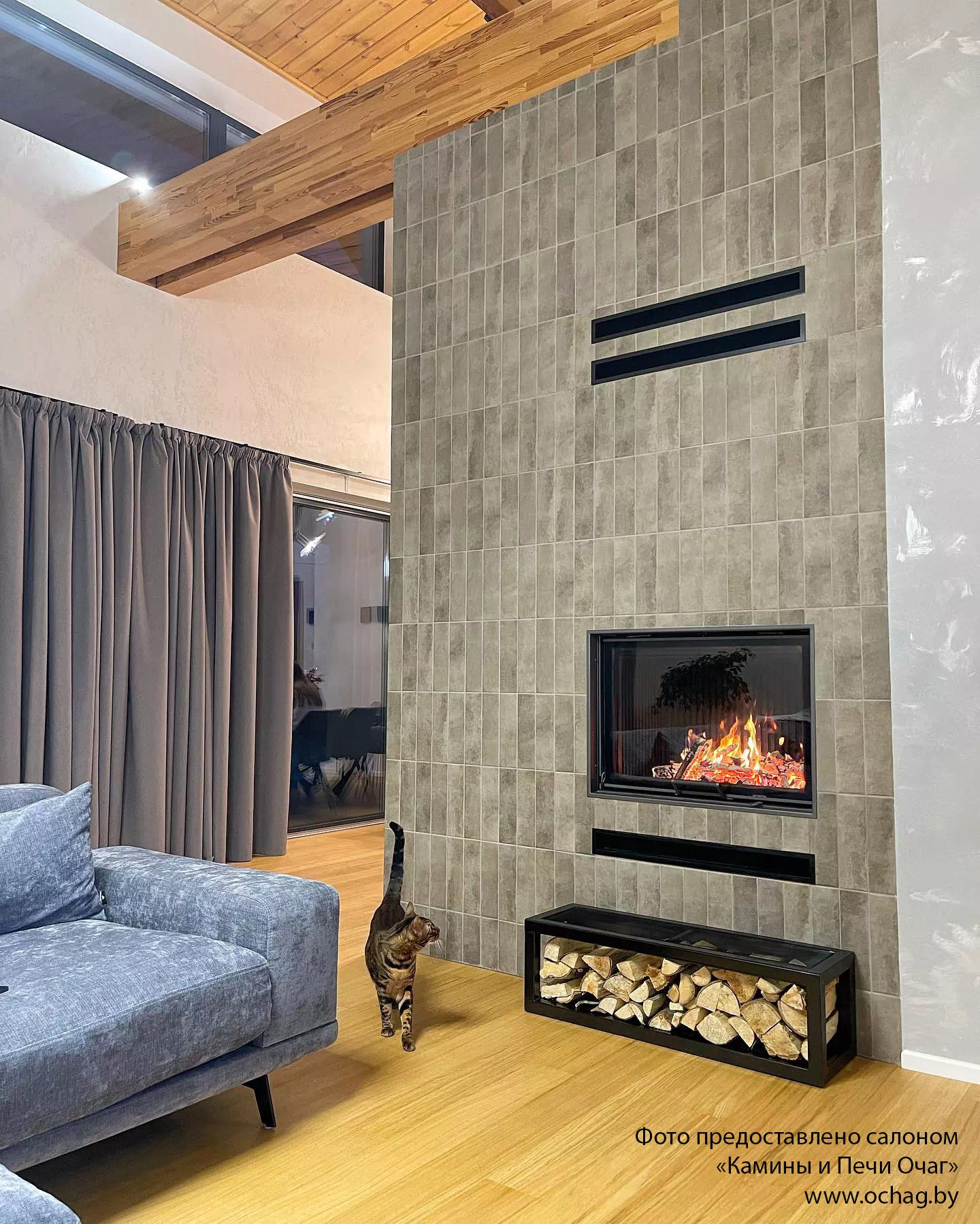 Топка имеет двойной корпус. К внешнему, выполненному из котловой стали, приварены п-образные профили (рёбра жёсткости), таким способом, что, в металле, во время разогрева, не возникает деформации (предварительно напряжённая конструкция). Это обеспечивает неизменность формы, эффективность теплопередачи и долговечность. Футеровка формирует структуру, несущую на себе всю термическую нагрузку. Шамот, керамические вставки – стенки разогреваются продолжительно, температура повышается дольше, чем с металлическим содержимым. Превосходно для любителей долго пожечь. Панели 3Д – сбалансированный вариант, тепло распределяется равномерно, а внушительная масса поддерживает высокотемпературное горение. Широкие стальные пластины для стиля хай-тек. Бесколосниковая система, с КПД 82% Вид на огонь