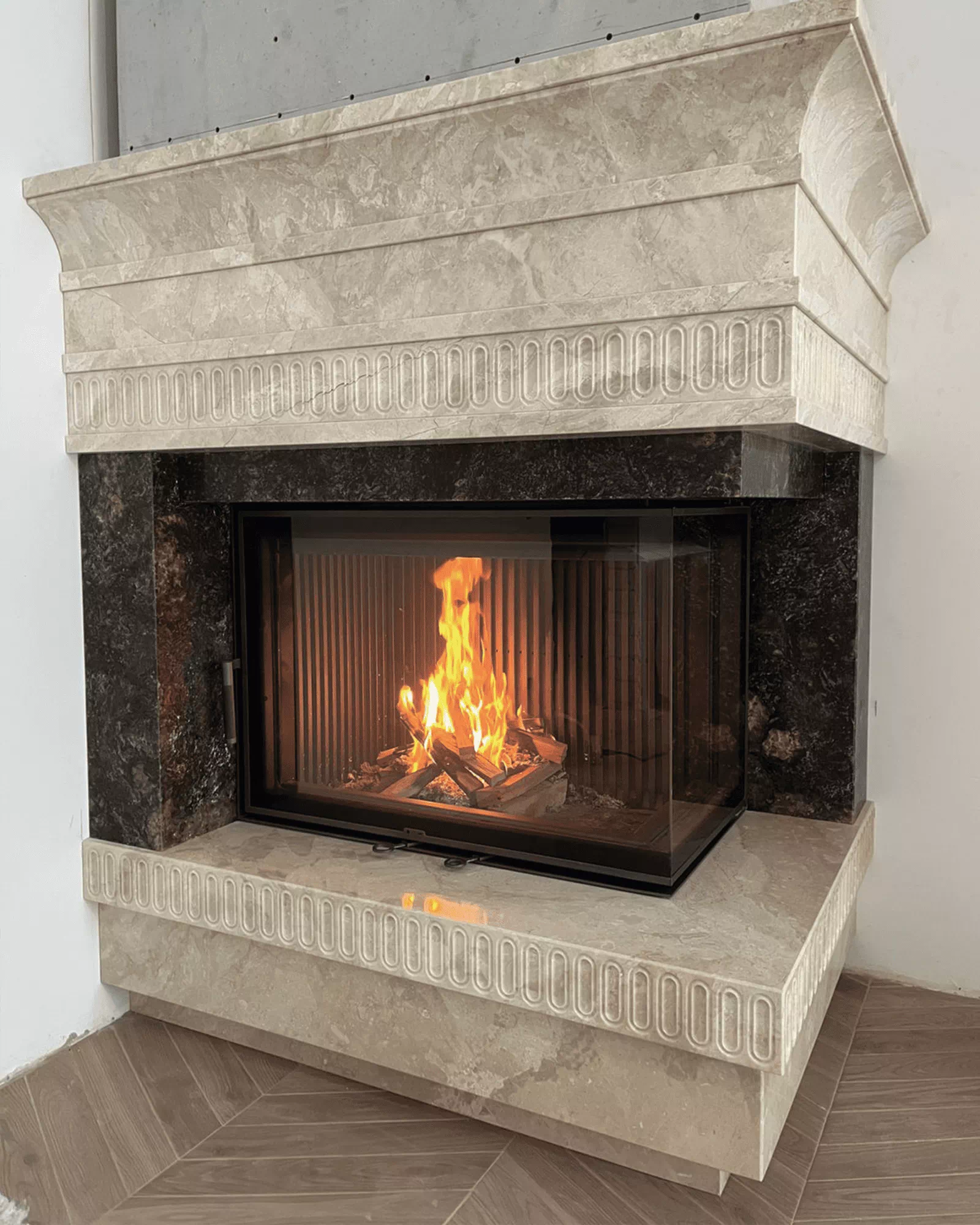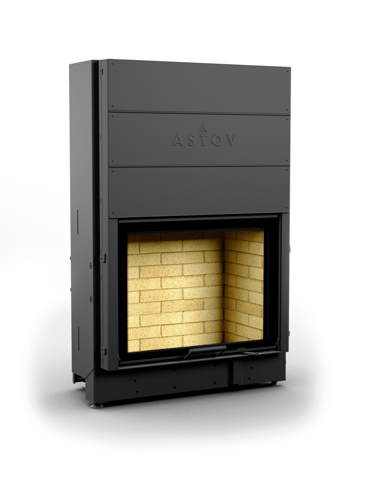 Топка имеет двойной корпус. К внешнему, выполненному из котловой стали, приварены п-образные профили (рёбра жёсткости), таким способом, что, в металле, во время разогрева, не возникает деформации (предварительно напряжённая конструкция). Это обеспечивает неизменность формы, эффективность теплопередачи и долговечность. Футеровка формирует структуру, несущую на себе всю термическую нагрузку. Шамот, керамические вставки – стенки разогреваются продолжительно, температура повышается дольше, чем с металлическим содержимым. Превосходно для любителей долго пожечь. Панели 3Д – сбалансированный вариант, тепло распределяется равномерно, а внушительная масса поддерживает высокотемпературное горение. Широкие стальные пластины для стиля хай-тек. Вид на огонь