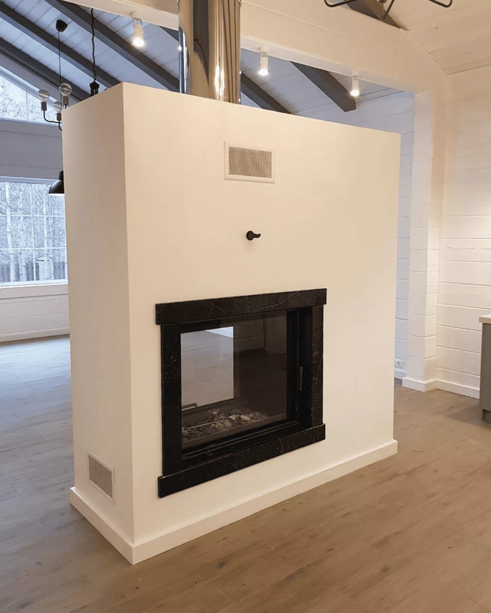Две дверцы с прямым стеклом. Пространная, сквозная модель, великолепно вписывается в межкомнатные перегородки, для созерцания огня как из гостиной, так и из спальни или кабинета, служит отличной основой для создания центрального (островного) камина. Увеличенный обзор, благодаря специальной рамке. Шелкография завершает обрамление очага, гармонируя с внутренним убранством топочной части. Усиленный воздушный поток на дожиг, предохраняет стеклокерамику от нагара. Обе застеклённые поверхности остаются неизменно чистыми, пока вы протапливаете. Плотное прижимание дверки в нижней точке закрывания и качественные регуляторы позволяют без напряжения управлять огненным процессом, от практически невидимого до бушующего. Ручка для открывания, бархатная на ощупь, не обжигает руки. Дверь поднимается легко и бесшумно, благодаря особенным, долговечным приспособлениям. Подъёмный механизм располагается с одной стороны. Мощность топки и необходимые габариты подходящего помещения