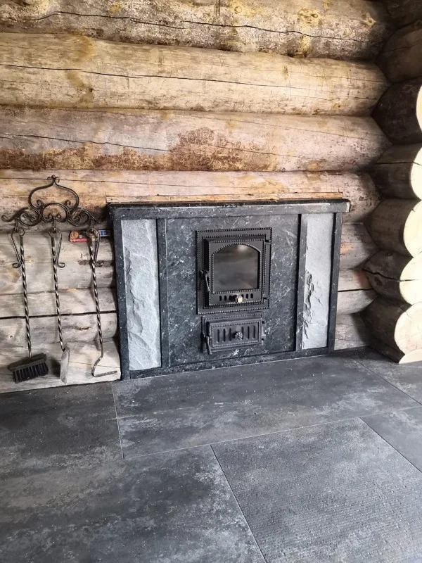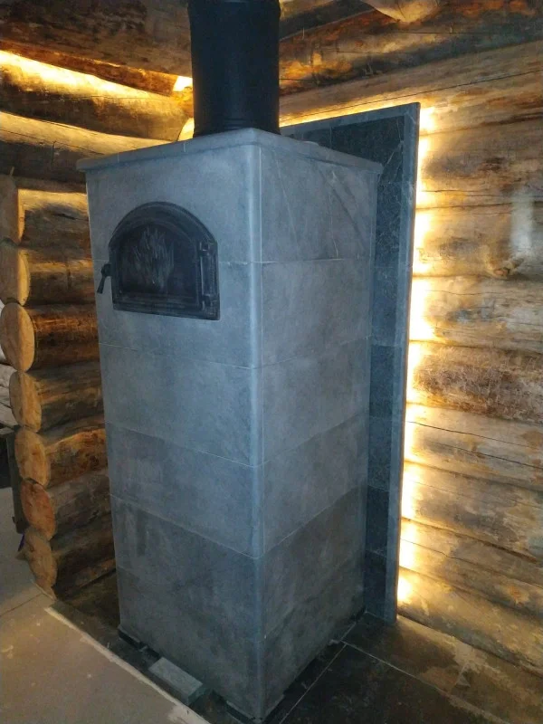 Внешний корпус из шлифованного талькохлорита или пироксенита с обработкой Антик толщиной 40 мм.