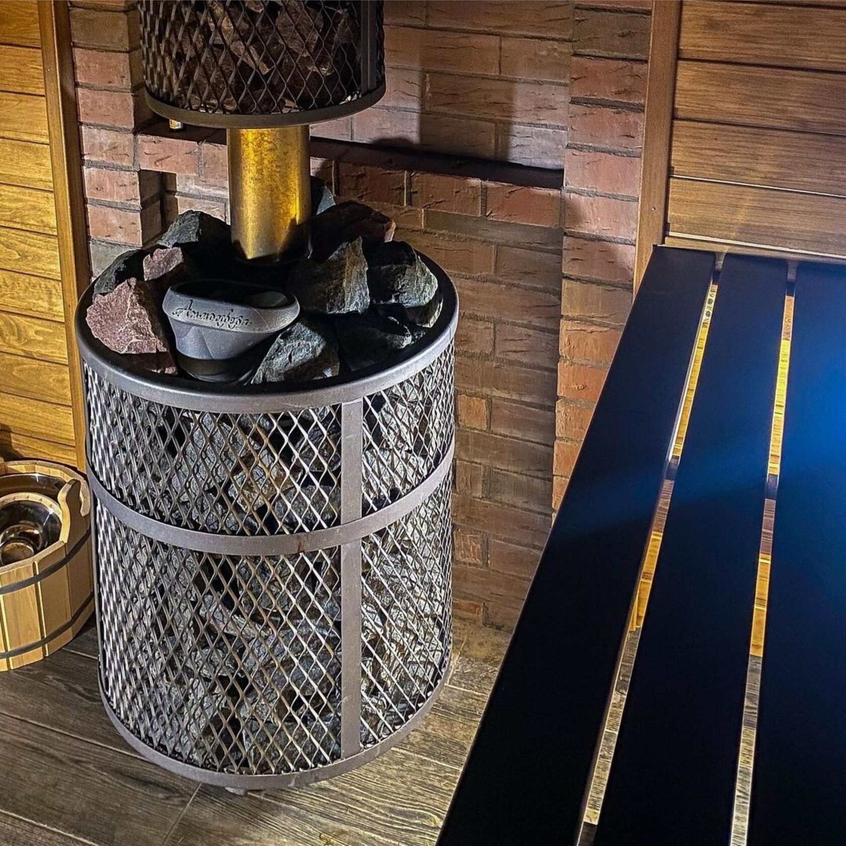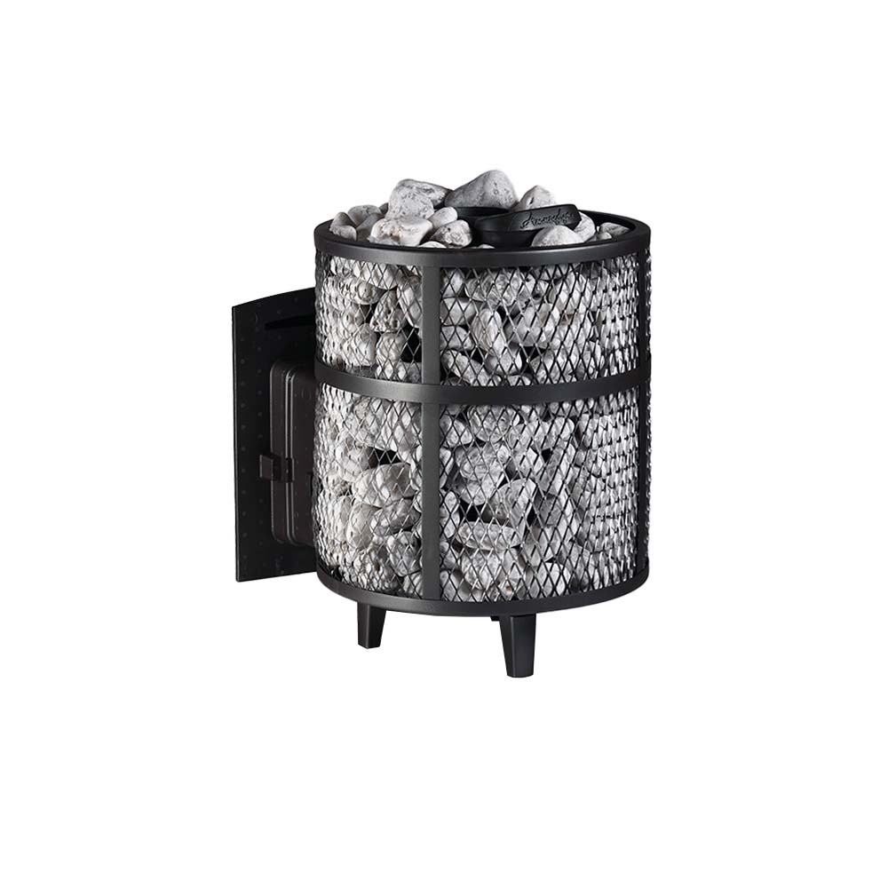 Ультра компактная модель банной печи. Кожух печи изготовлен в виде сетки из нержавеющей стали и полностью заполняется природными камнями, обеспечивая высокую динамику нагрева парильного помещения.