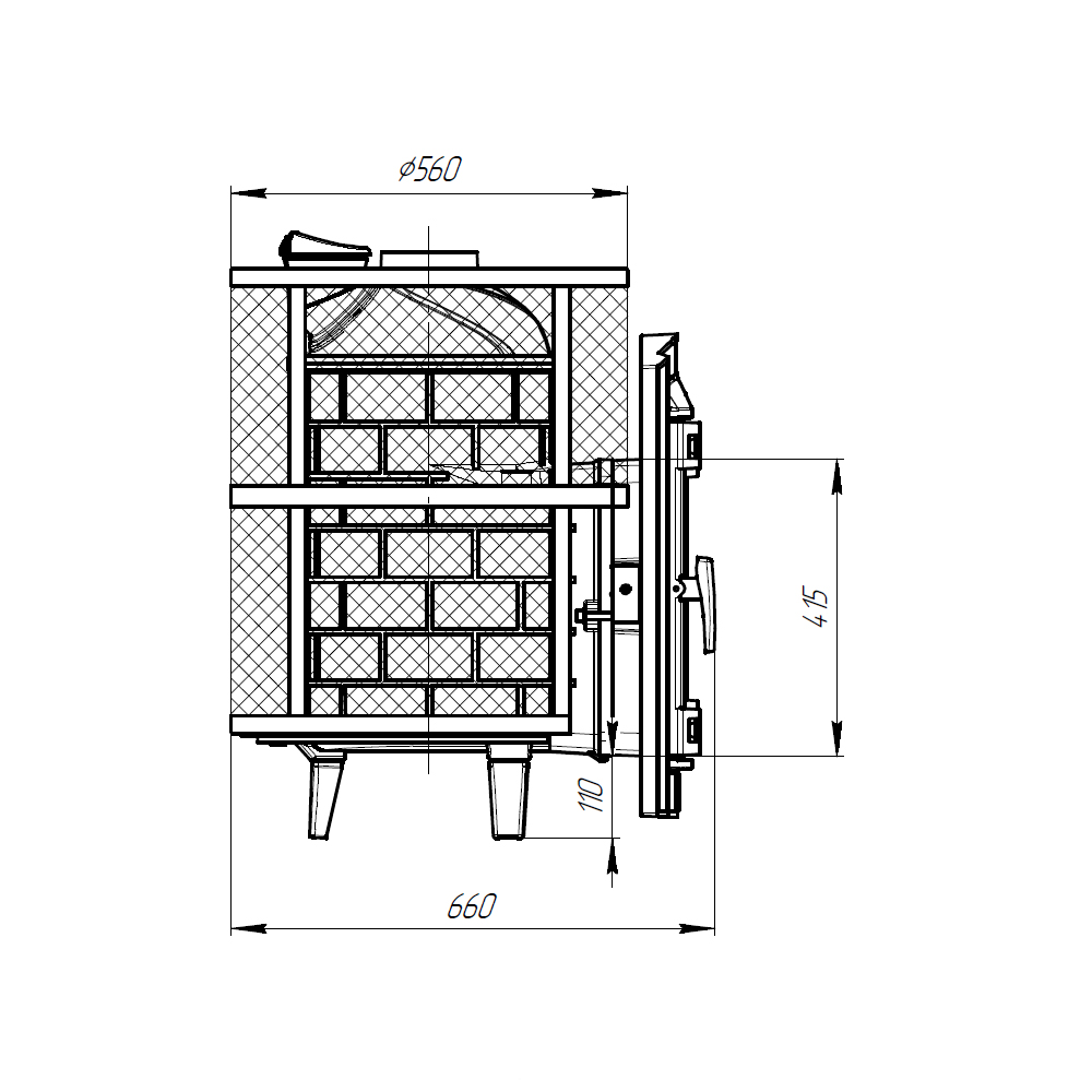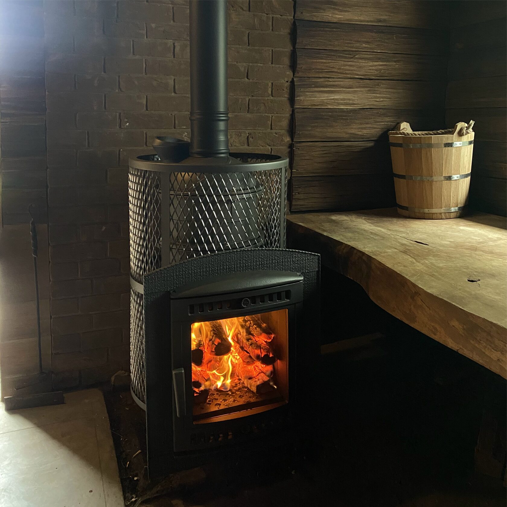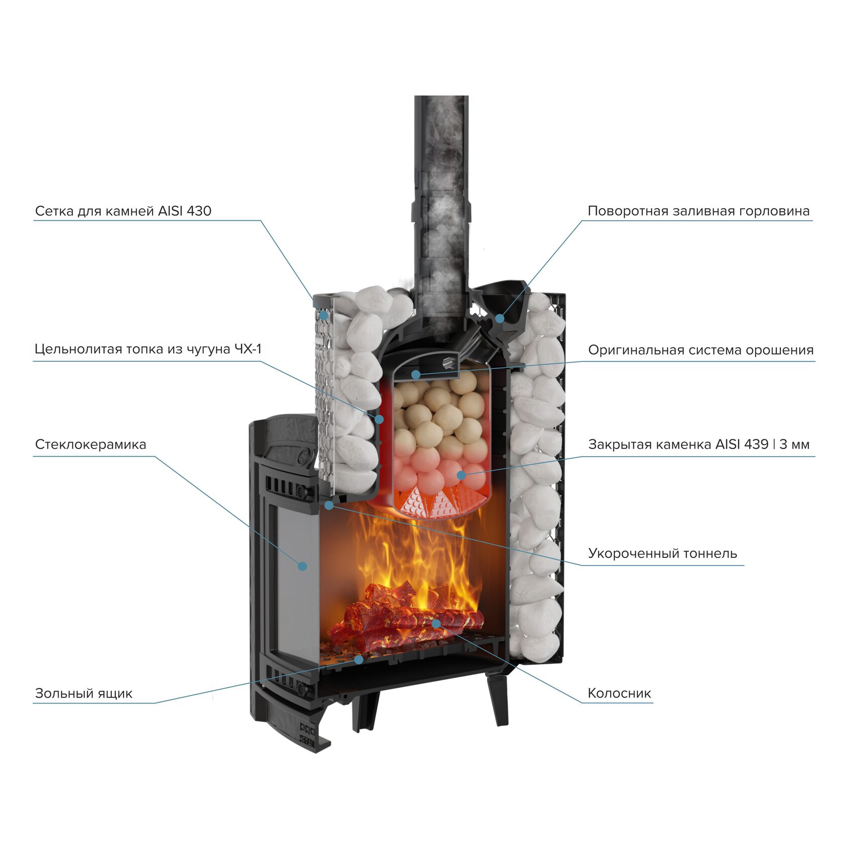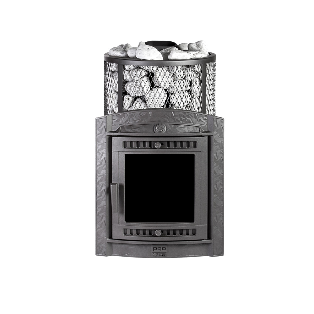 Компактная и экономичная модель с коротким топливным тоннелем. Кожух печи изготовлен в виде сетки из стали и полностью заполняется природными камнями, обеспечивая высокую динамику нагрева парильного помещения.