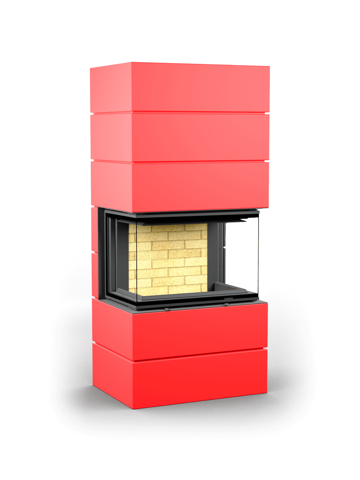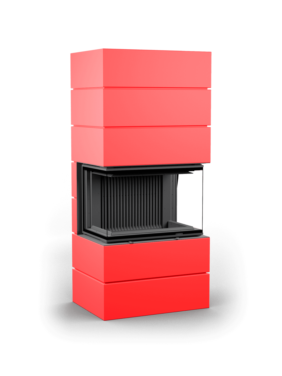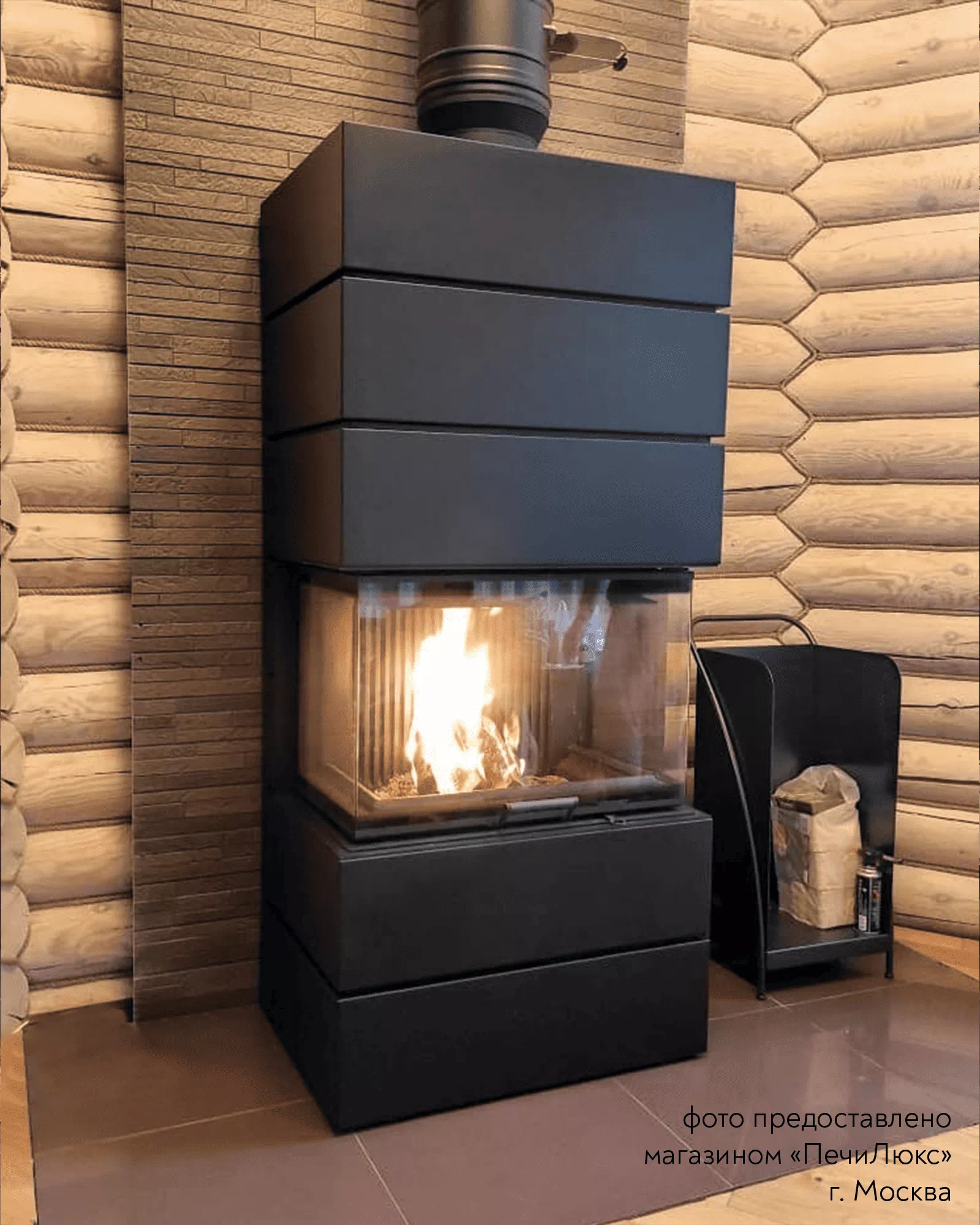 Печь-Камин на базе трехсторонней топки с максимальной панорамой пламени создает прекрасный вид на огонь из любой точки помещения.
