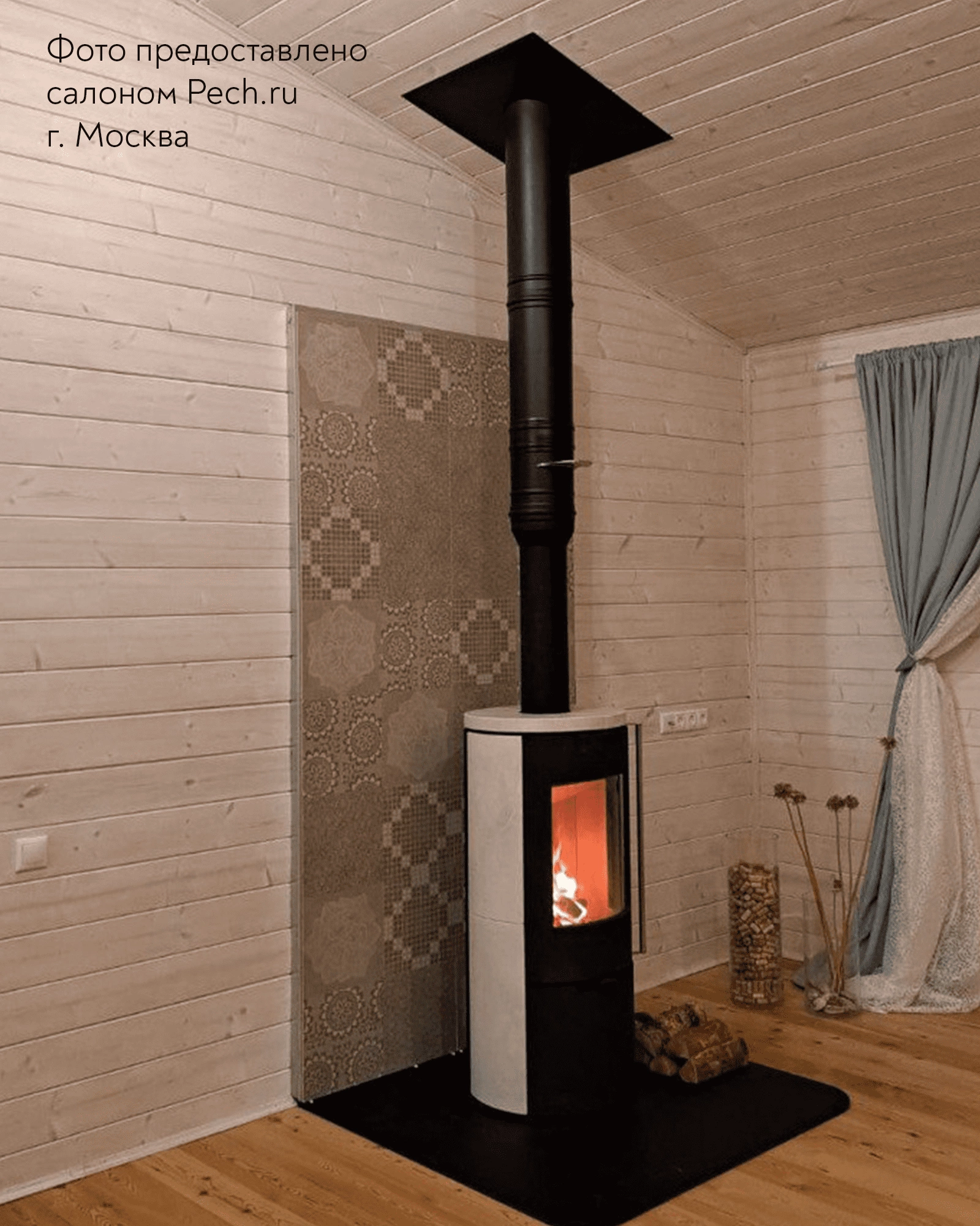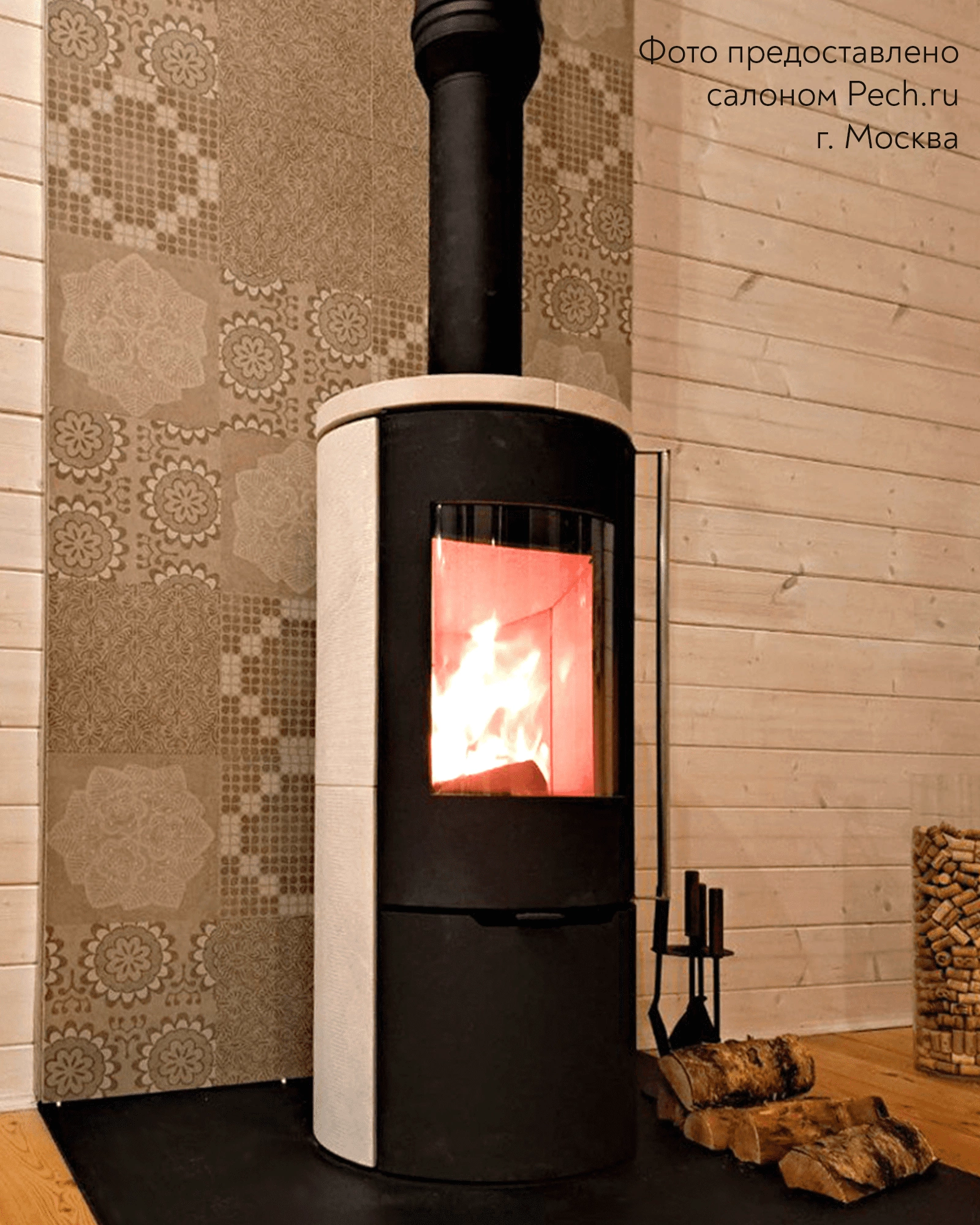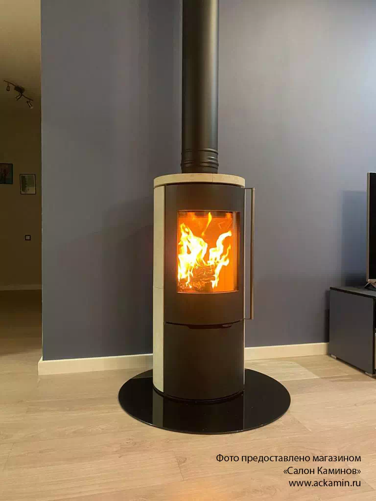Печь-Камин R1.0 K c каменными панелями и круглой задней стенкой c максимальной панорамой пламени создает прекрасный вид на огонь из любой точки помещения. Возможна установка поворотного механизма (+30 000 руб.)