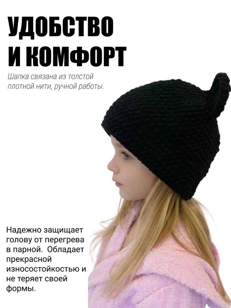 Шапка вязаная для бани и сауны ручной с ушками работы детская Вязаная шапка Black Banya для бани и сауны Premium надежно защищает голову от перегрева в парной. Имеет свободный крой, отлично сидит на голове и не дает пару попасть внутрь. Шапка связана из толстой плотной нити, ручной работы. Волокно очень мягкое и легкое. Обладает прекрасной износостойкостью. Не теряет своей формы. Любители современного стиля оценят вязаную шапку Black Banya Premium по достоинству. Размер универсальный. Рекомендац